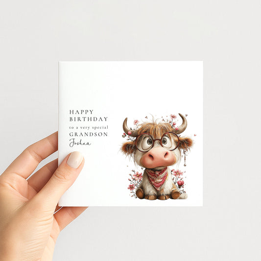 Grandson Birthday Card – Personalised Highland Cow Keepsake With Name