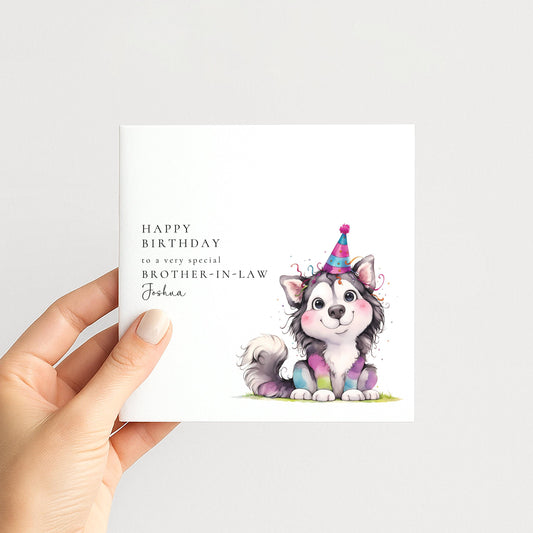 Brother In Law Birthday Card - Personalised Dog Illustration With Confetti & Party Hat