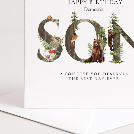 Personalised Son Birthday Card – Custom Name Woodland Keepsake With Envelope