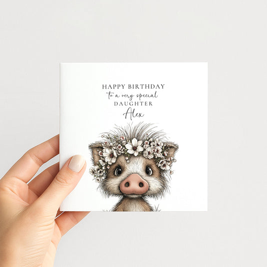 Daughter Birthday Card – Personalised Floral Crown Piglet Design, Premium Matte