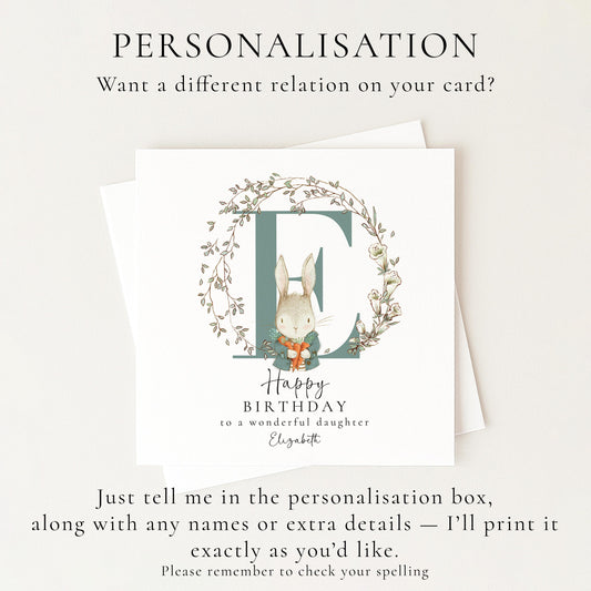 Daughter Birthday Card - Personalised Floral Rabbit Design With Initial