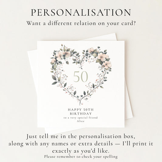 50th Birthday Card – Personalised Floral Heart Design | Elegant Milestone Greeting
