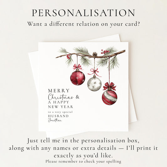 Christmas Husband Card – Personalised Matte Finish Holiday Greeting With Red Silver Baubles