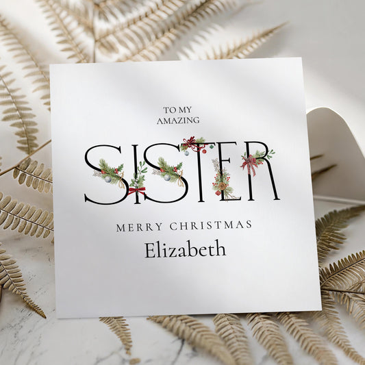 Sister Christmas Card – Personalised Festive Sister Gift With Winter Greenery
