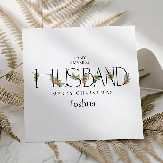 Husband Christmas Card – Personalised Festive Greeting With Winter Greenery Design